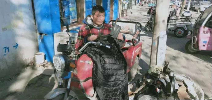 周备战在连董事长送的电动车上为群众缝补羽绒袄